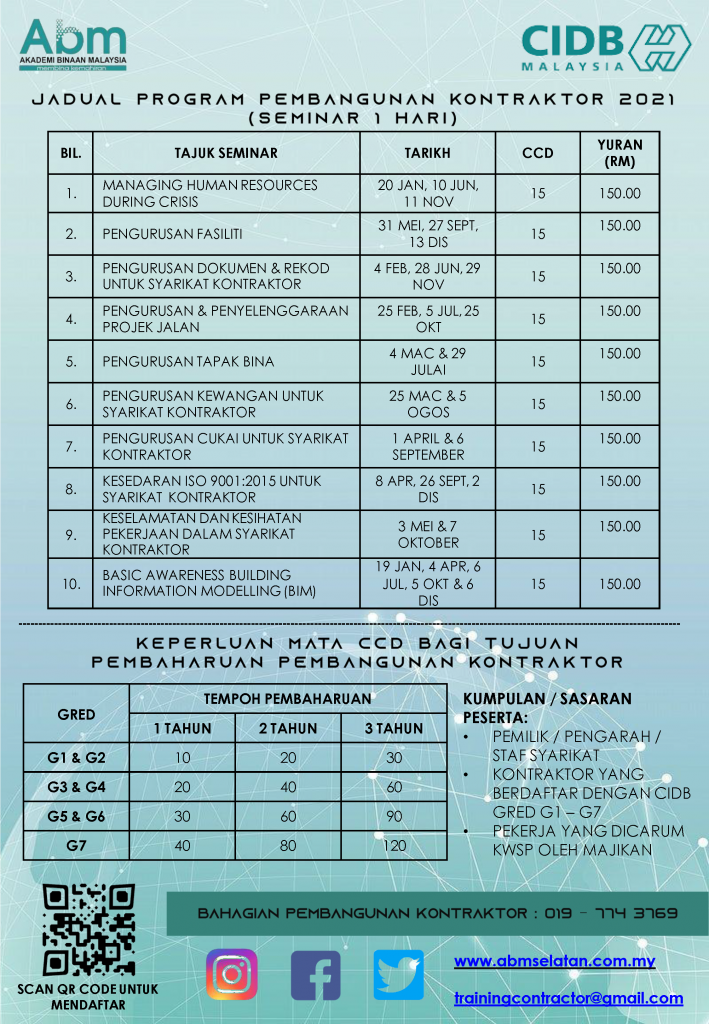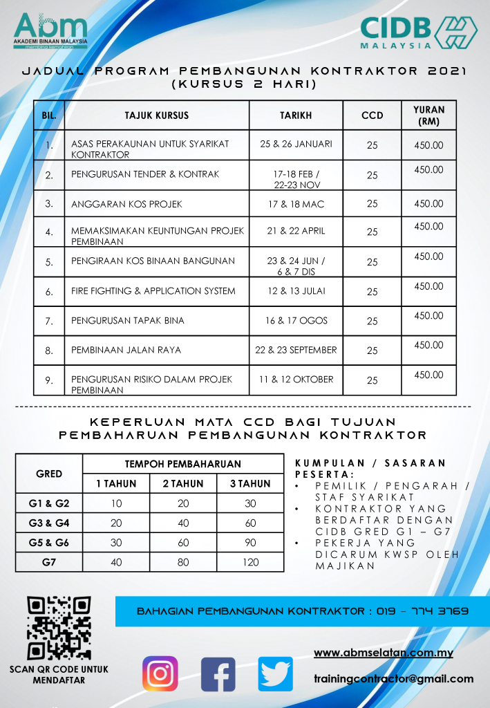 Untuk maklumat lanjut sila hubungi kami di talian 07-2388152 atau 07-2443291 smb 214/215 For enquiry please contact 07-2388152 or 07-2443291 ext 214/215 Whats App : 019-774 3769 AKADEMI BINAAN MALAYSIA WILAYAH SELATAN Lot 2067 Batu 3 Jalan Tampoi 81200 Johor bahru Johor Darul Takzim Tel : 07 – 2388152 Fax : 07 – 2345808 Website : www.abmselatan.com.my